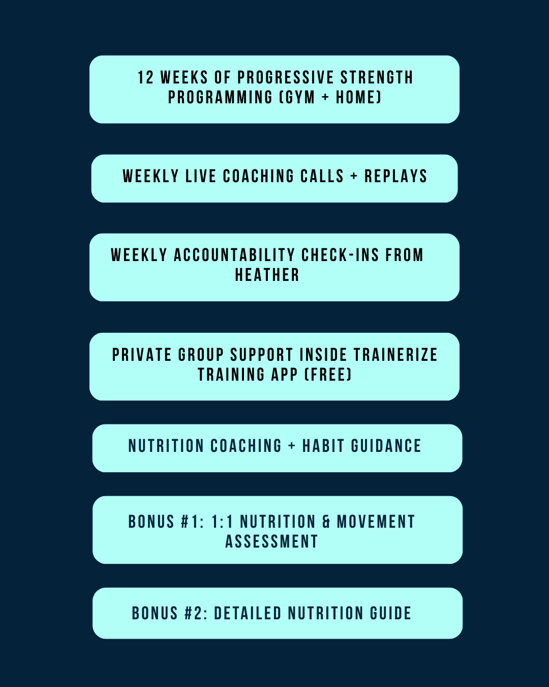 This is your chance for 12-weeks of strength-based workouts plus lifestyle and nutritional coaching specifically for working moms who want real results—without burnout, guilt, or life revolving around your fitness routine.